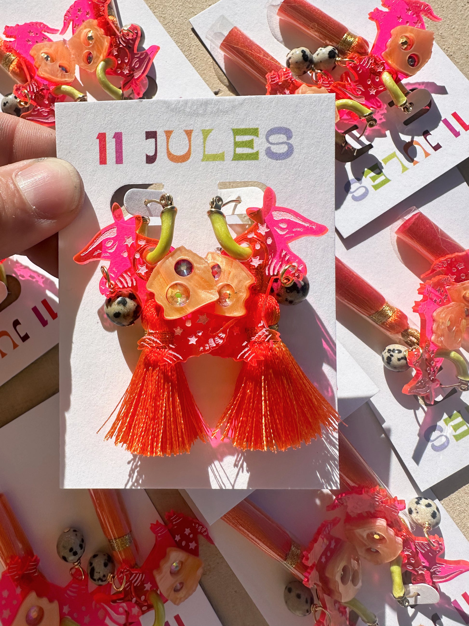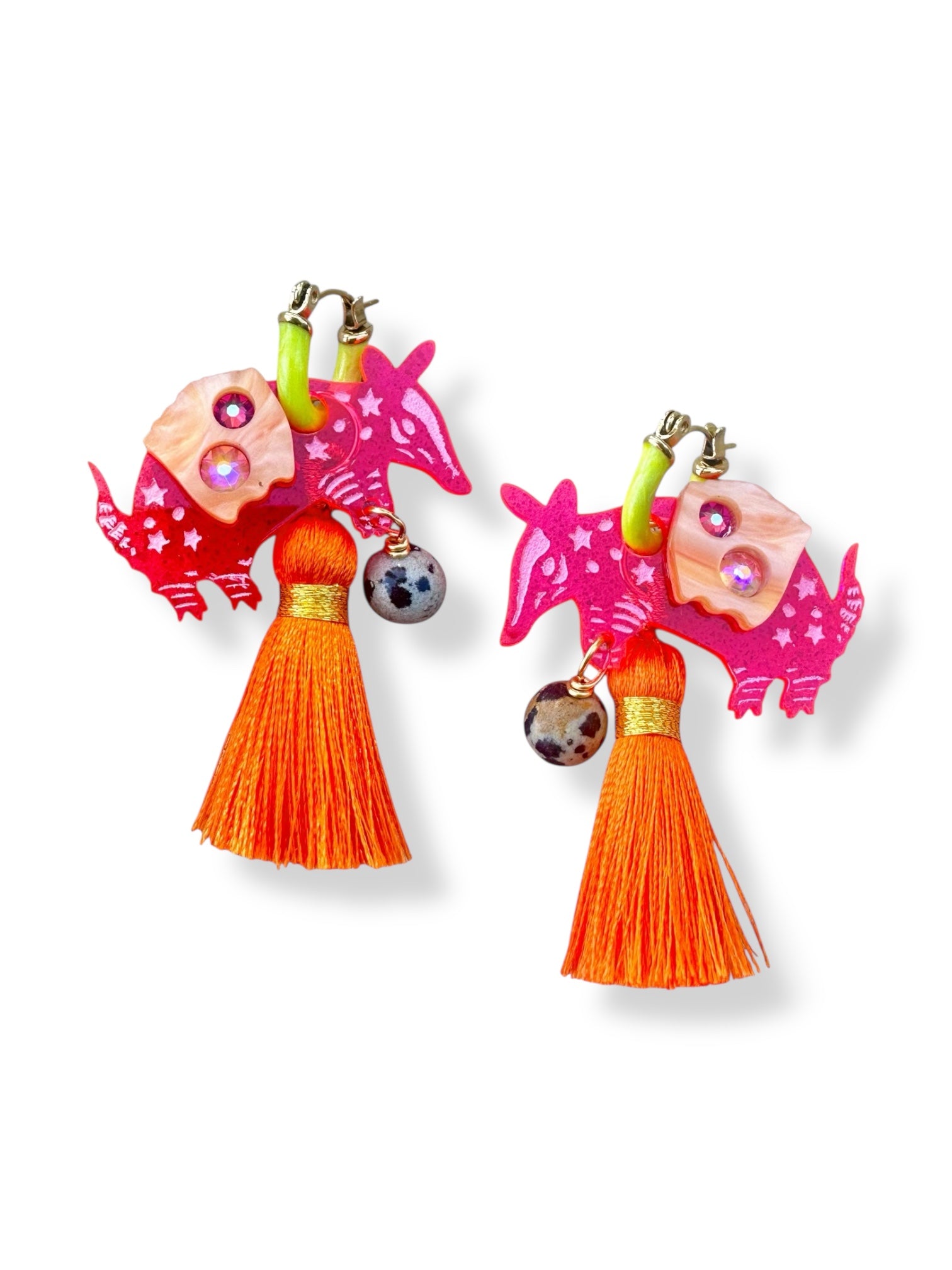 hand painted details, crystals, dalmatian jasper, orange tassels and yellow hoops
