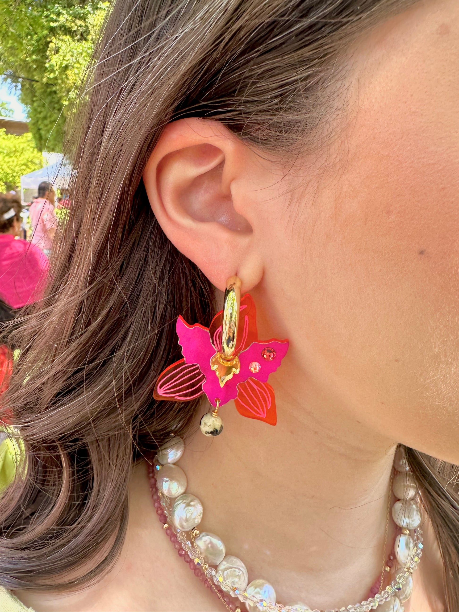 quirky orchids with shell veneer, crystals, hand painted details and beaded dangles