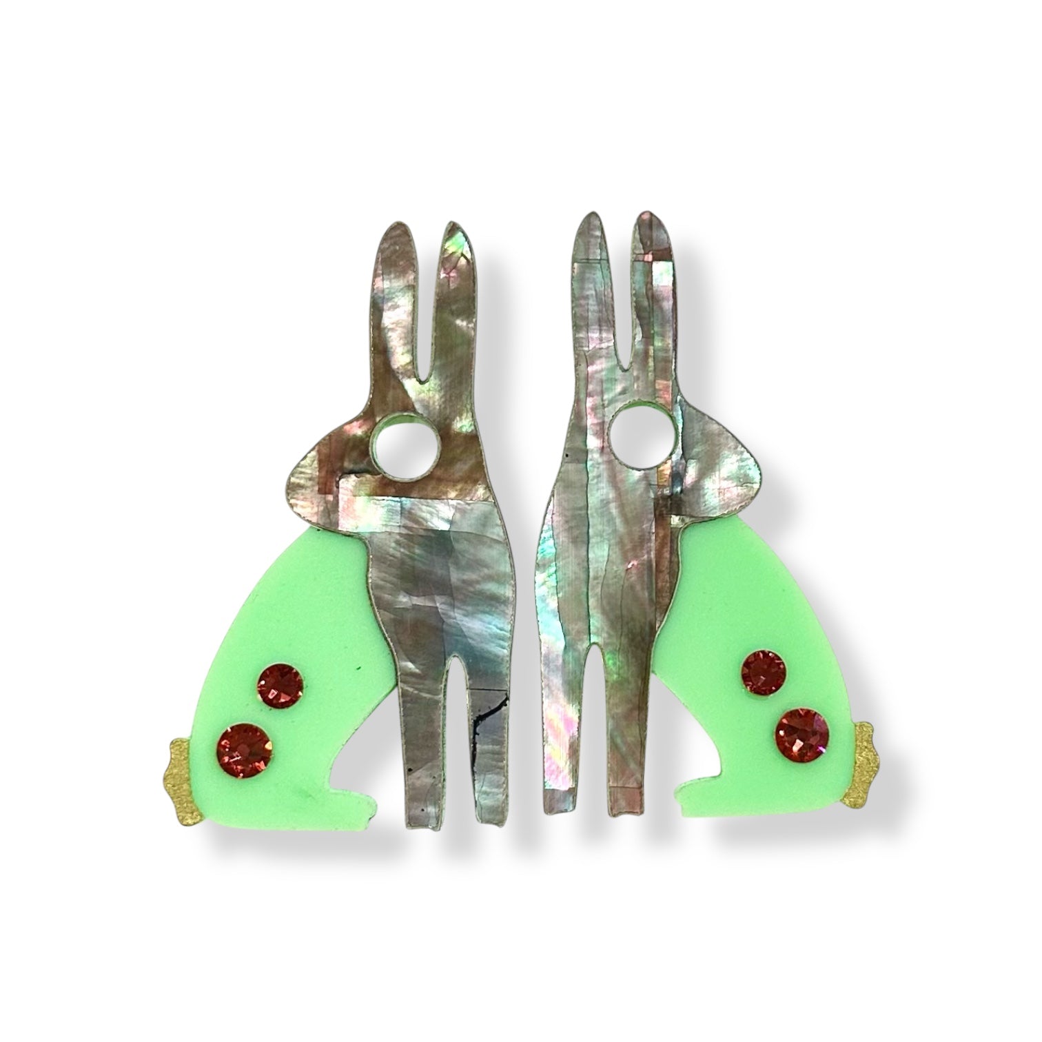 quirky rabbits with crystals, hand-painted details and abalone shell