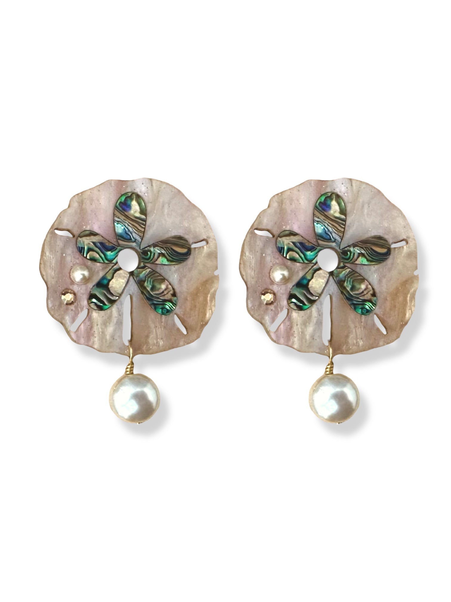 quirky hand drawn acrylic laser cut sand dollar with abalone shell veneer and glass pearls