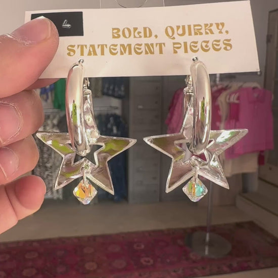 quirky silver stars with wood veneer backing and dangling crystal pendants