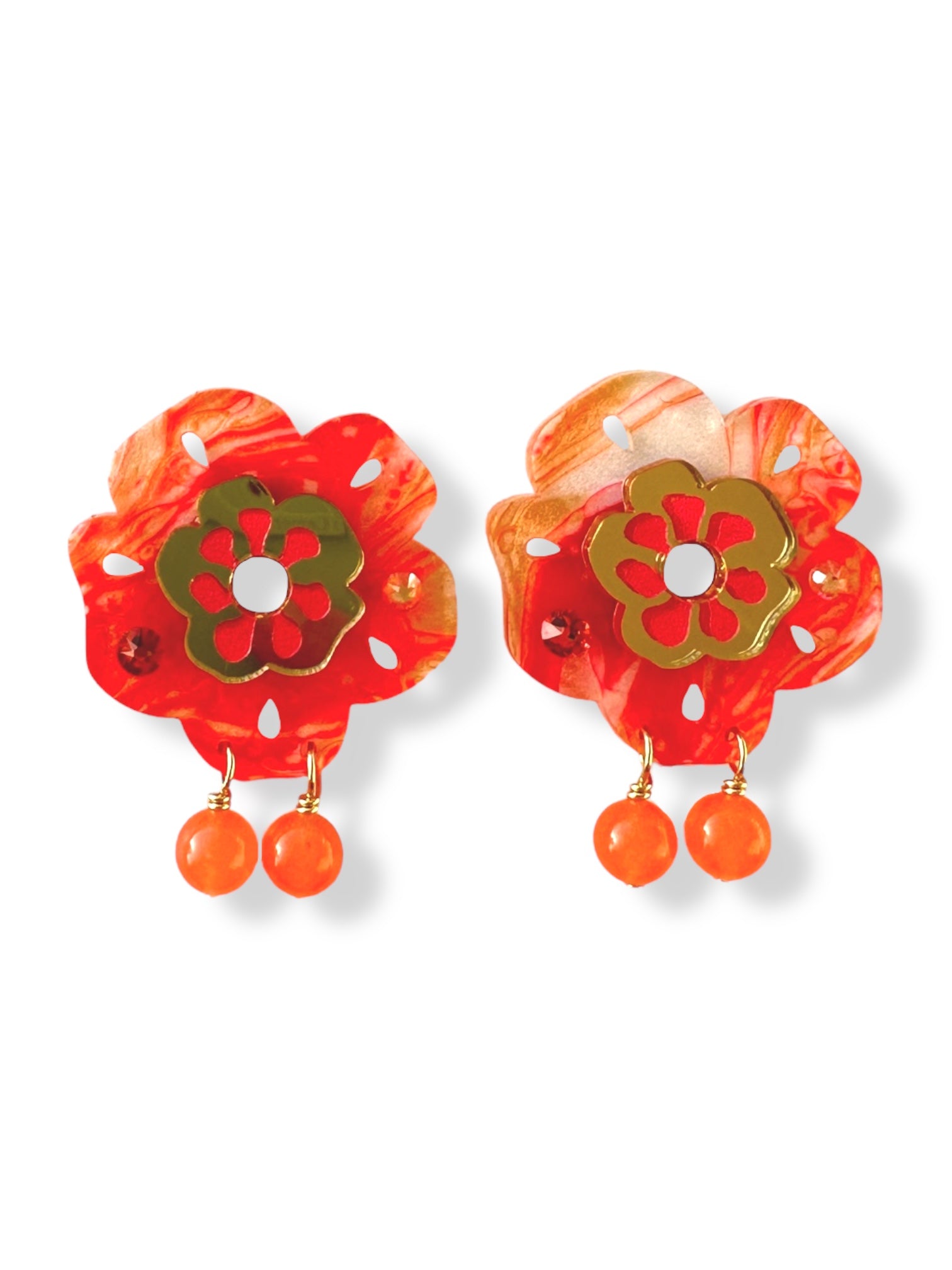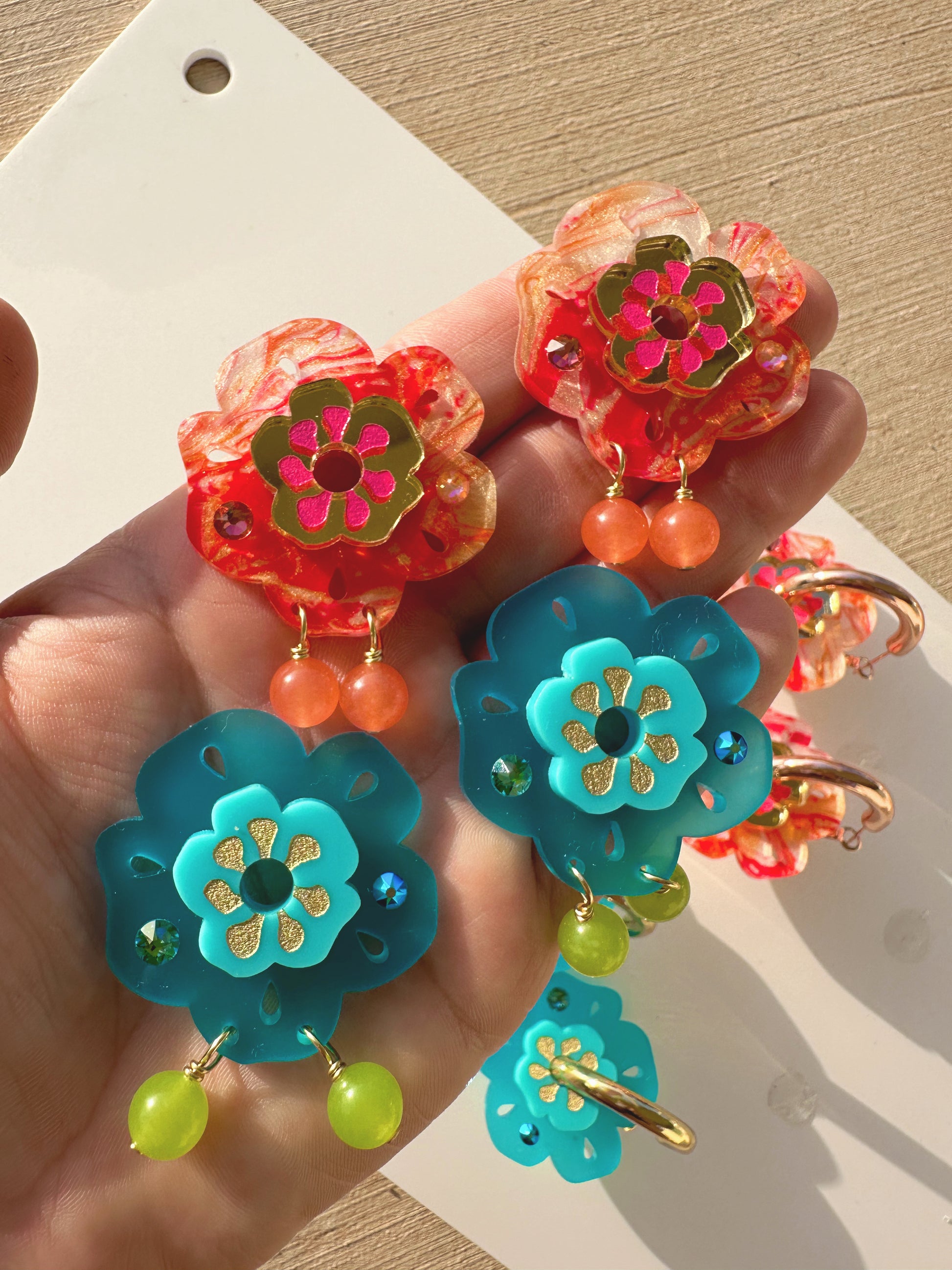 quirky whimsical flowers with crystals, hand painted details and beaded dangles