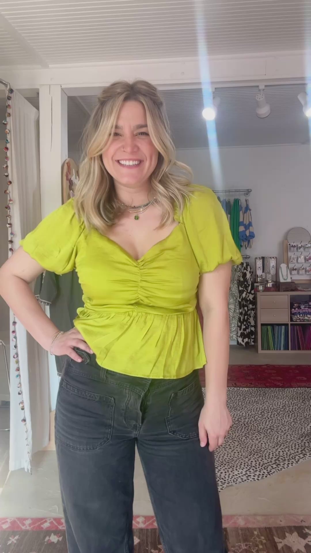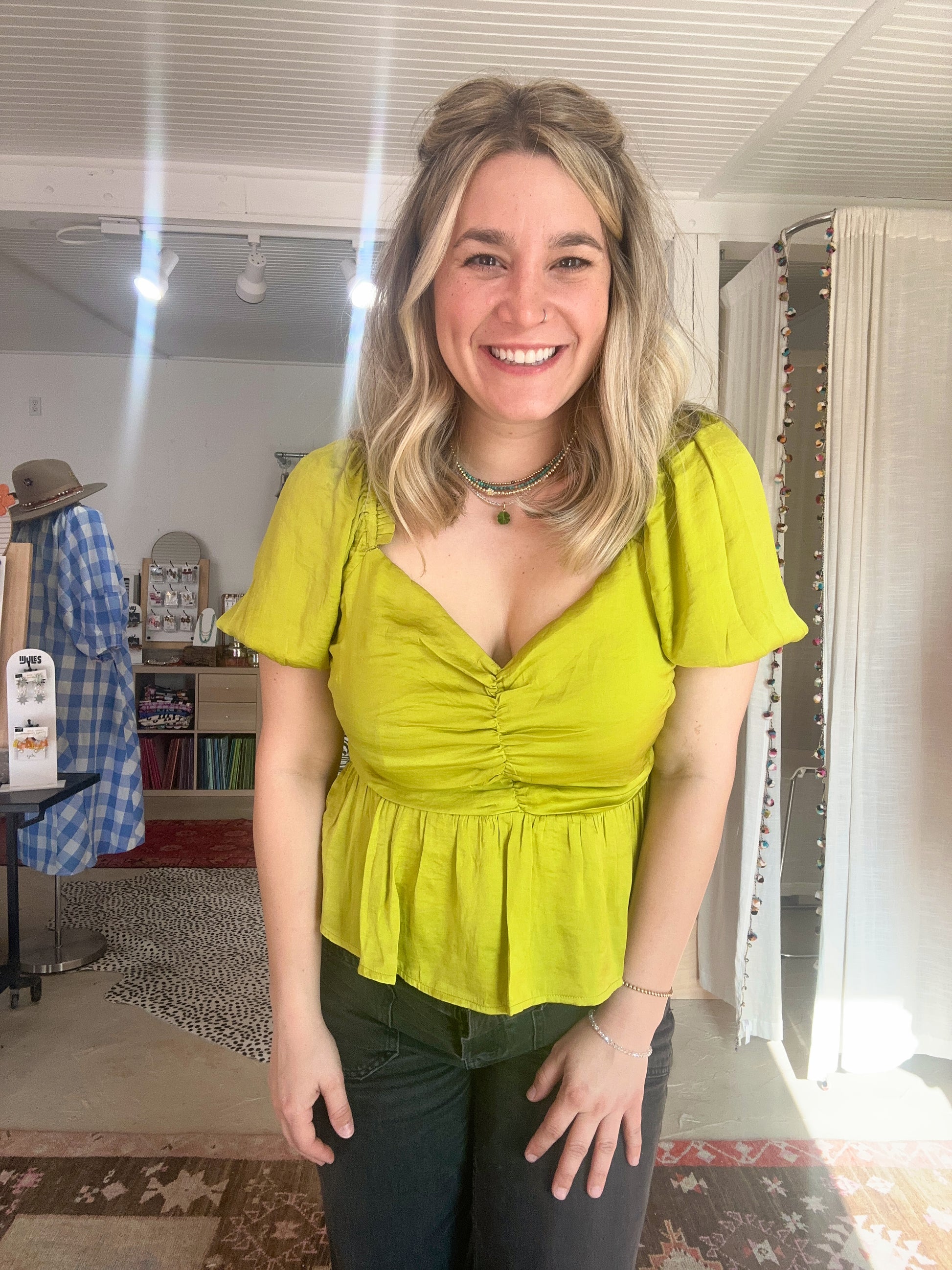 puff sleeves, ruched front with smocked back